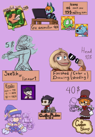 finished drawing (color + shading) : head 10$ / half-body 15$ / full-body 30$